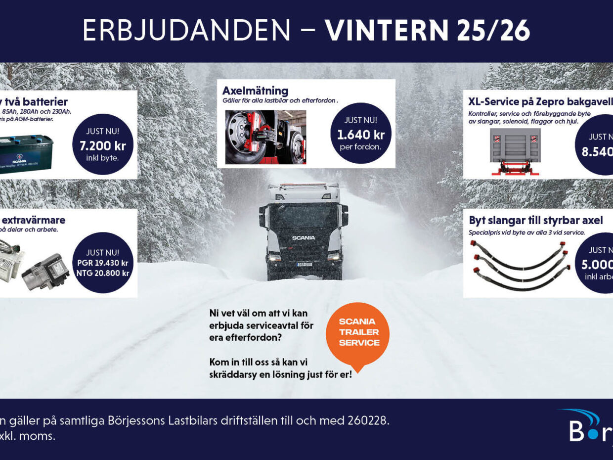 Några fina erbjudanden som vi har under vintern 25/26. Erbjudanden gäller på samtliga Börjessons Lastbilars driftställen till och med 260228. Alla priser exkl. moms. Välkommen att kontakta oss!